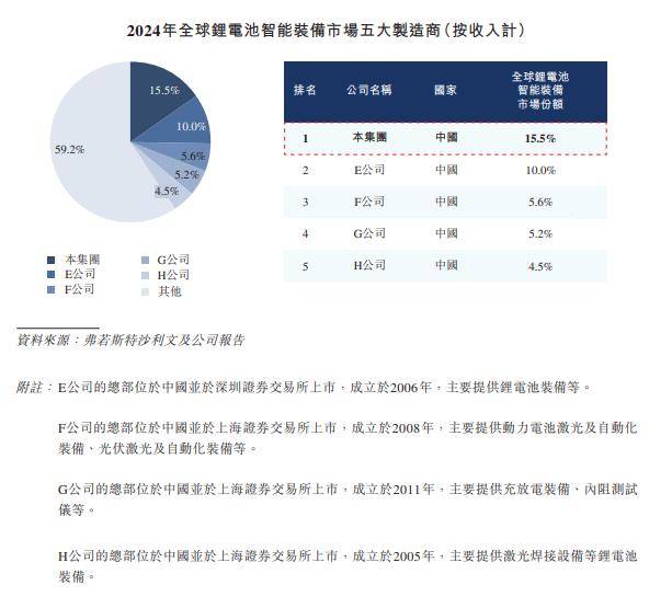正式登岸本钱市场,截至发稿时,总市值为759。91亿港元。公开材料显示:这家企业创立于2002年,总部位于江苏无锡高新区,正在全球设立19家分/子公司,具有60多个办事网点,产物远销美、德、法、日、韩等25个国度和地域。旗下营业涵盖锂电池智能配备、光伏智能配备、3C智能配备、智能物流、汽车产线、氢能智能配备等范畴。客户笼盖宁德时代(第一大客户)、特斯拉、公共、梅赛德斯、丰田、SK On、三星SDI、松下、ATL、中立异航、亿纬锂能、国轩高科、近景动力、比亚迪等电池、整车、光伏等范畴的头部厂商。按照弗若斯特沙利文(Frost & Sullivan)的材料,按2024年收入计较,是全球最大的锂电池智能配备供应商,市场份额15。5%;正在中国市场同样稳居第一,市场份额达19。0%。正在更大的“新能源智能配备”口径下,全球排名第二,市场份额2。9%。